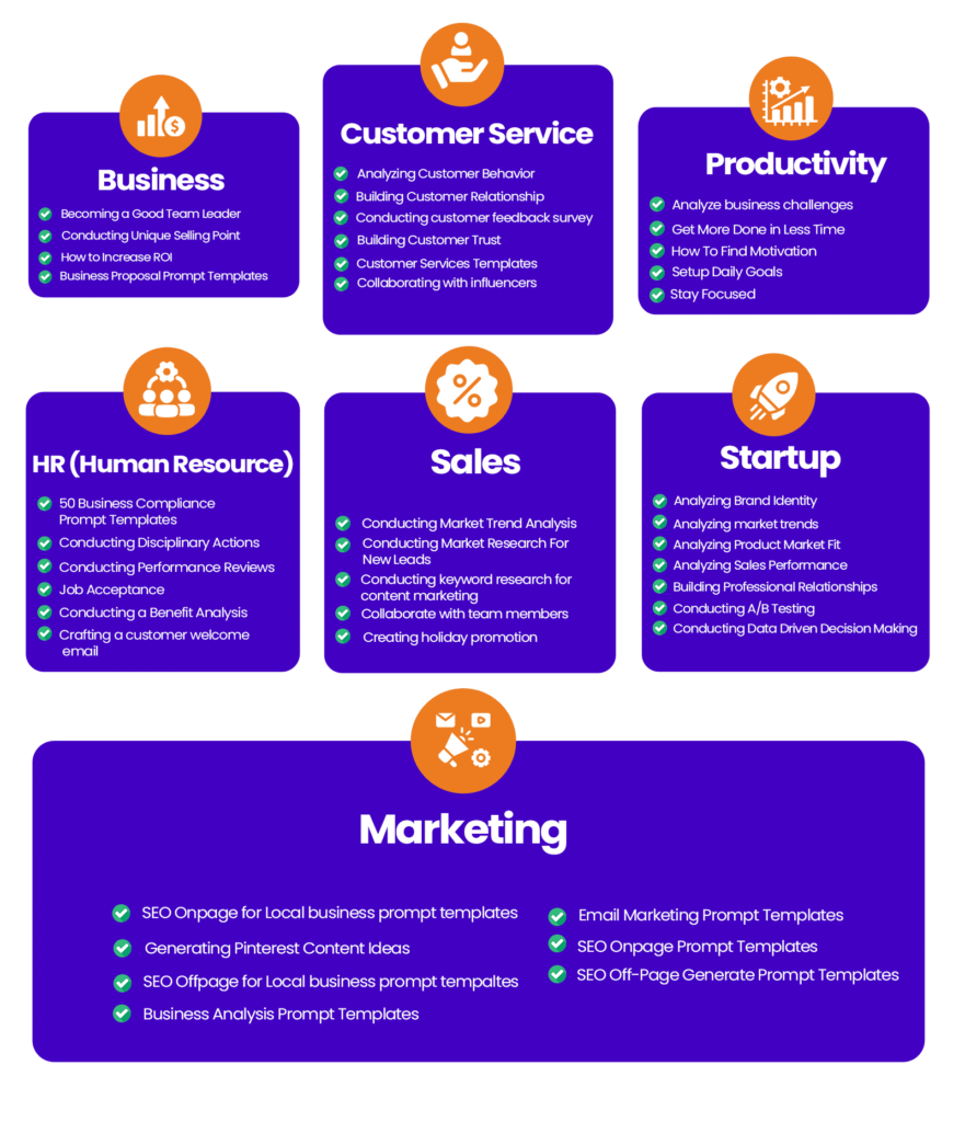 Expand knowledge: Our Package of ChatGPT Prompts cover a wide range of topics, marketing to self-help and new startups to sales and customer service. By investing in this package, you can expand your knowledge and learn about new subjects they may not have explored otherwise.