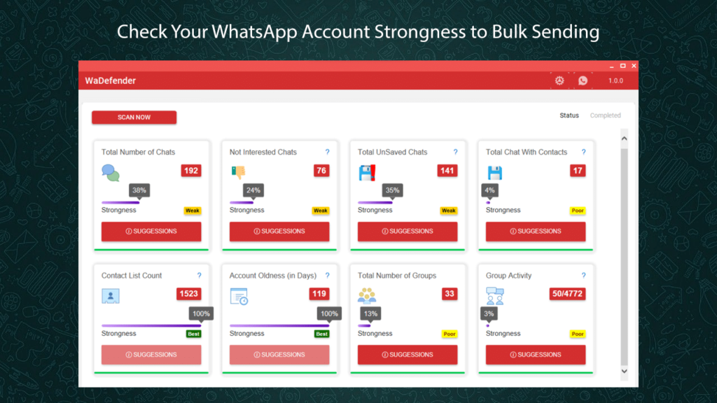 WaDefender considers factors like account age, activity level, and other parameters relevant to WhatsApp’s banning policies to determine account strength.